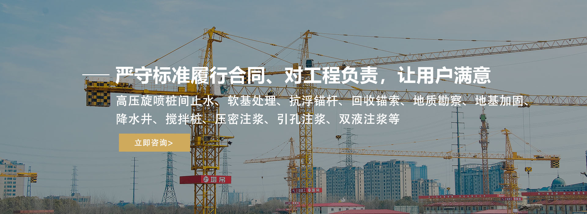 公司主營:高壓旋噴樁間止水、軟基處理、抗浮錨桿、回收錨索、地質勘察、地基加固、降水井、攪拌樁、壓密注漿、引孔注漿、雙液注漿等,公司規模龐大,不斷超越、追求完美,誠信為本、創新為貌、嚴守標準履行合同,工程優質、信譽至上,對工程負責,讓用戶滿意。
